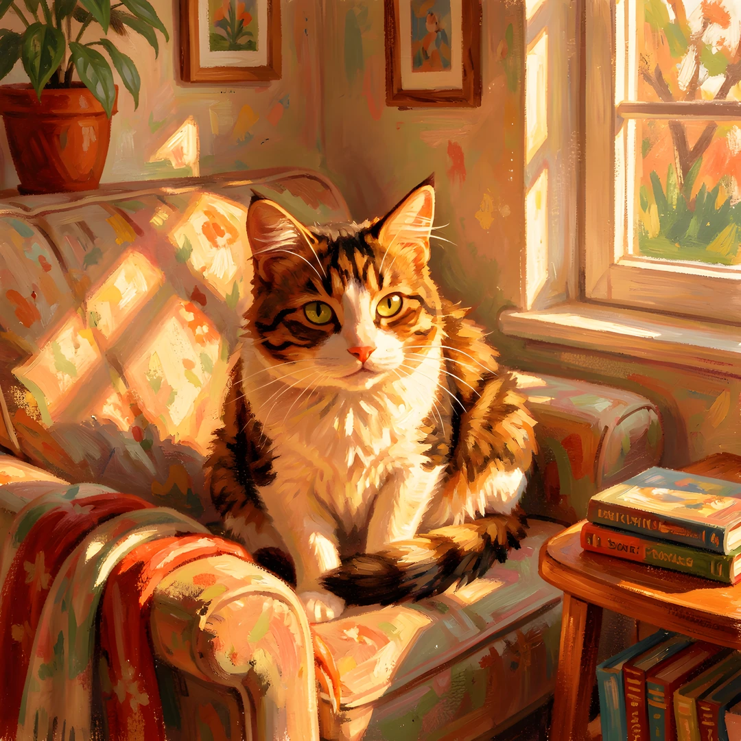 cat cozy dappled impressionist indoor light lofi warm