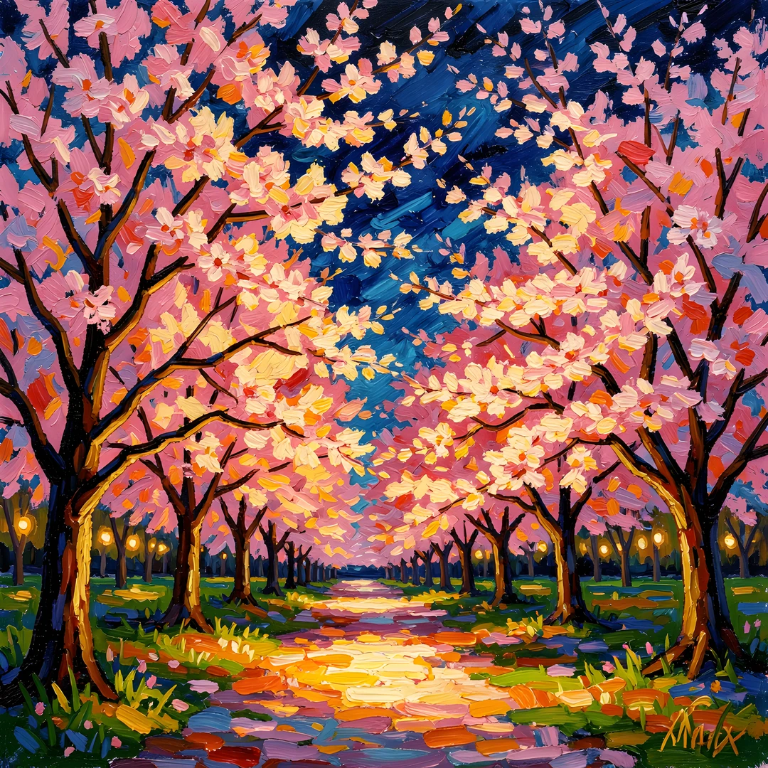blossom brushstrokes cherry colorful colors impressionist night park post spring thick