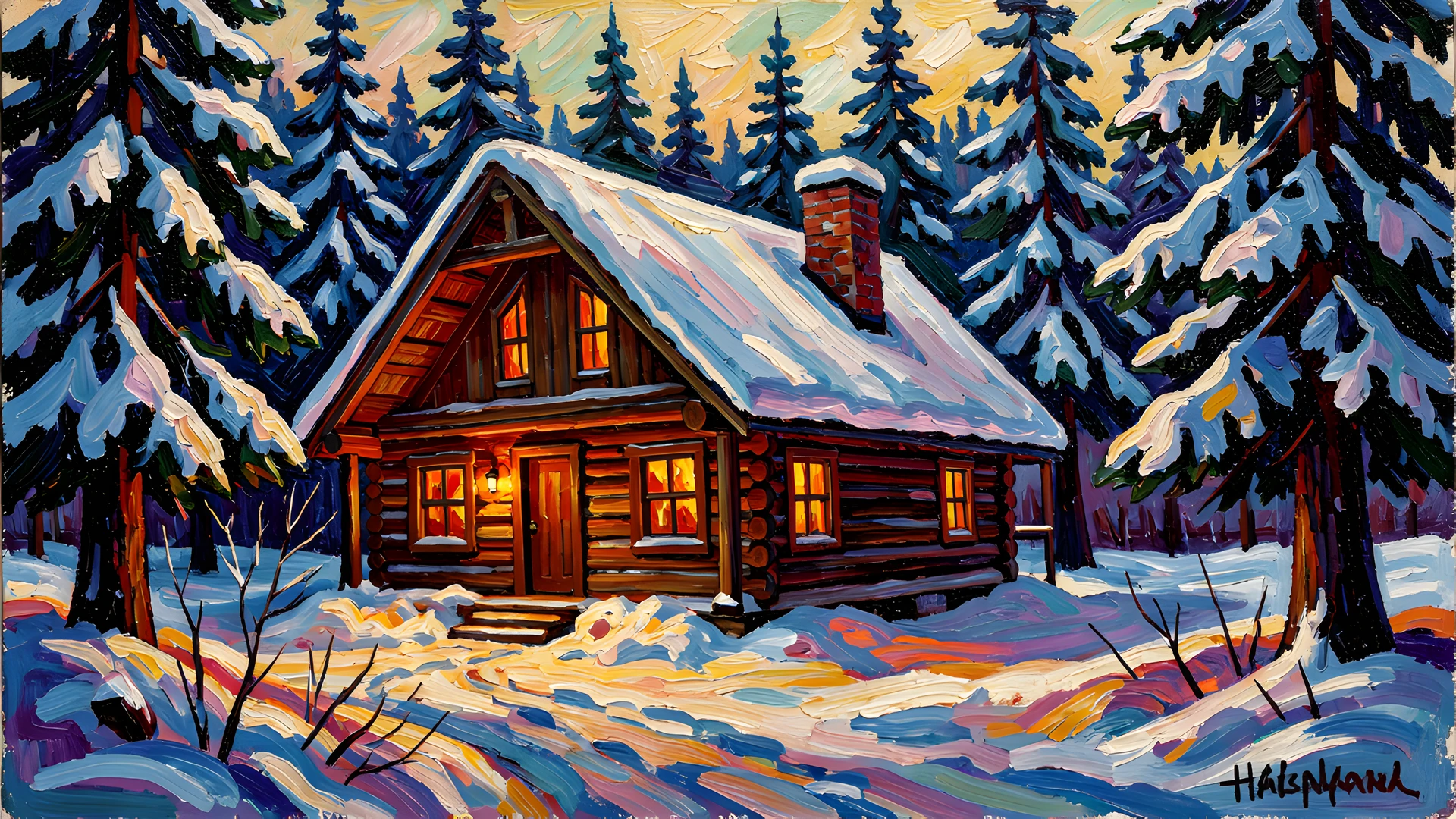 brushstrokes cabin colorful colors impressionist noir pine post snow thick