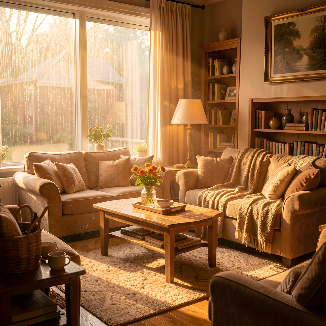 cozy living rain room sunlit warm