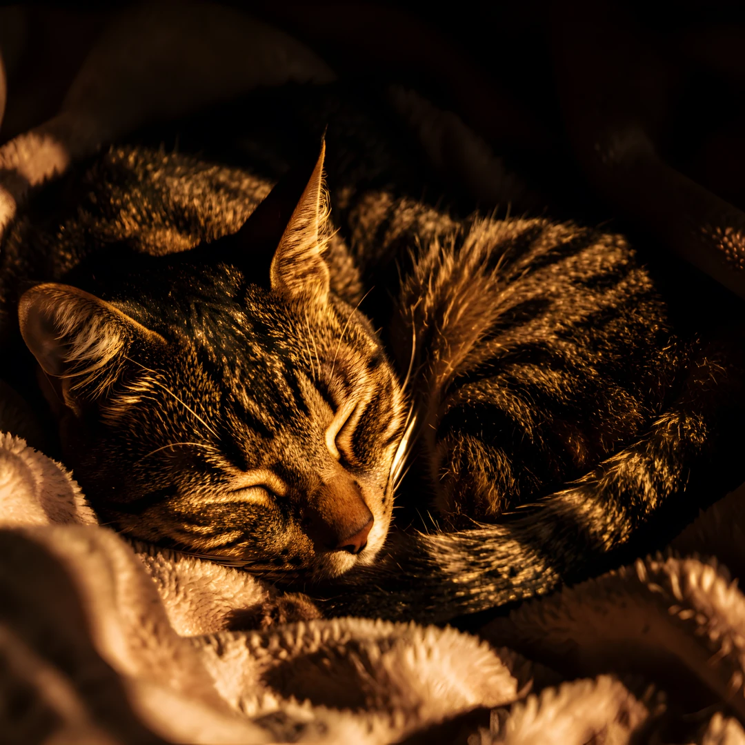 cat cozy deep golden highlight shadows sleeping tabby
