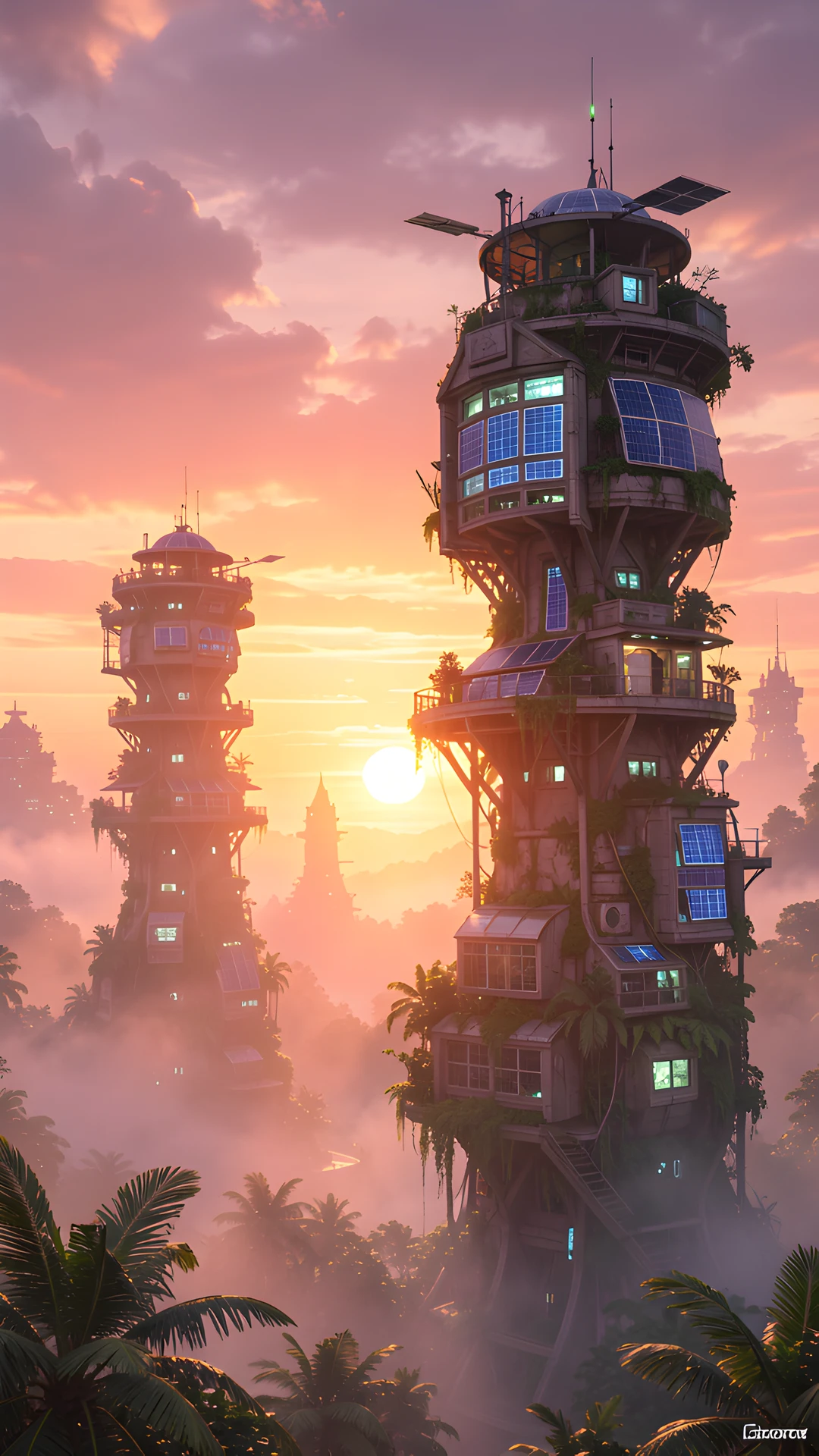 eco mist solarpunk sunset towers