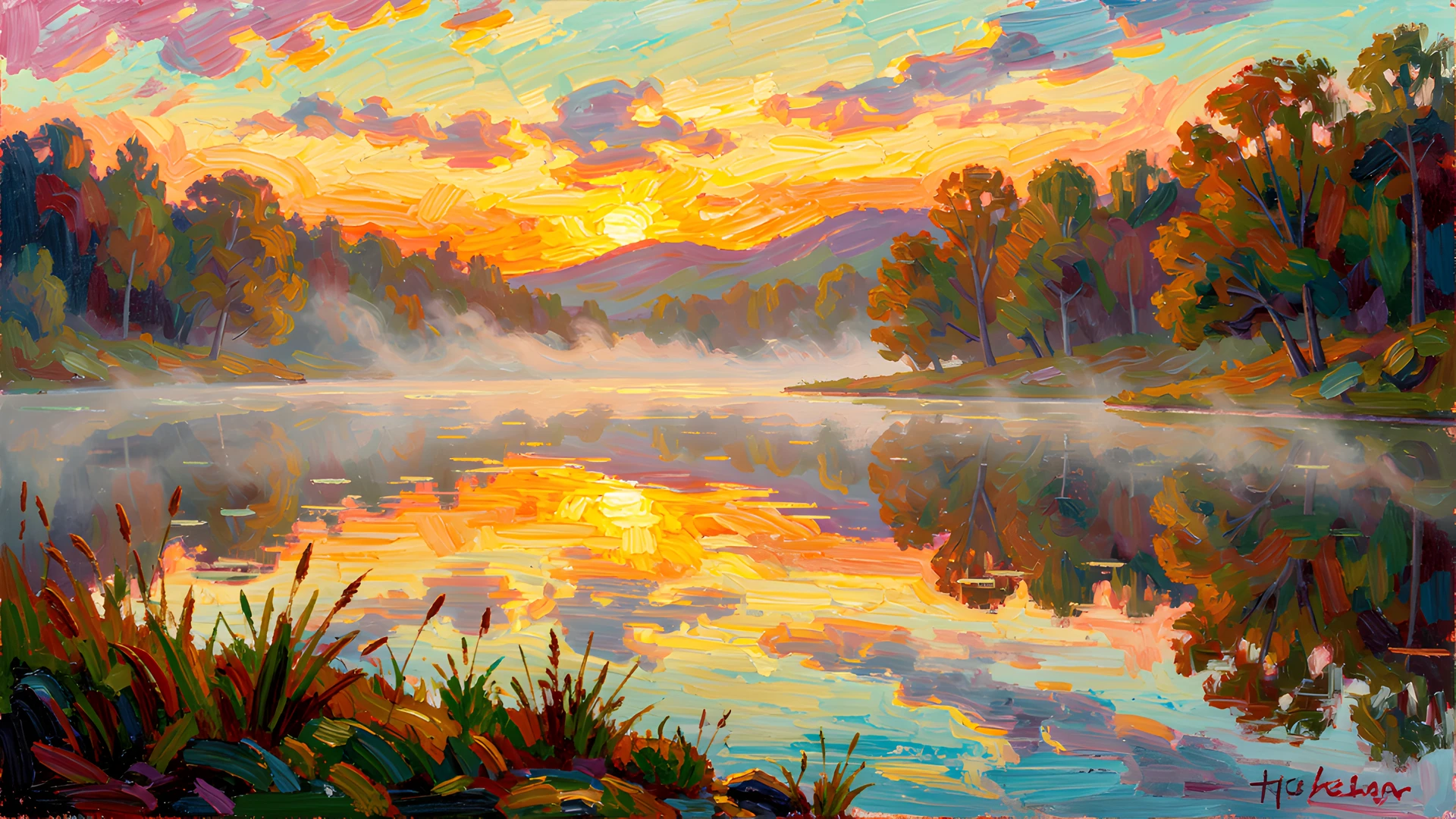 brushstrokes colorful colors impressionist lake mist morning post sunrise thick