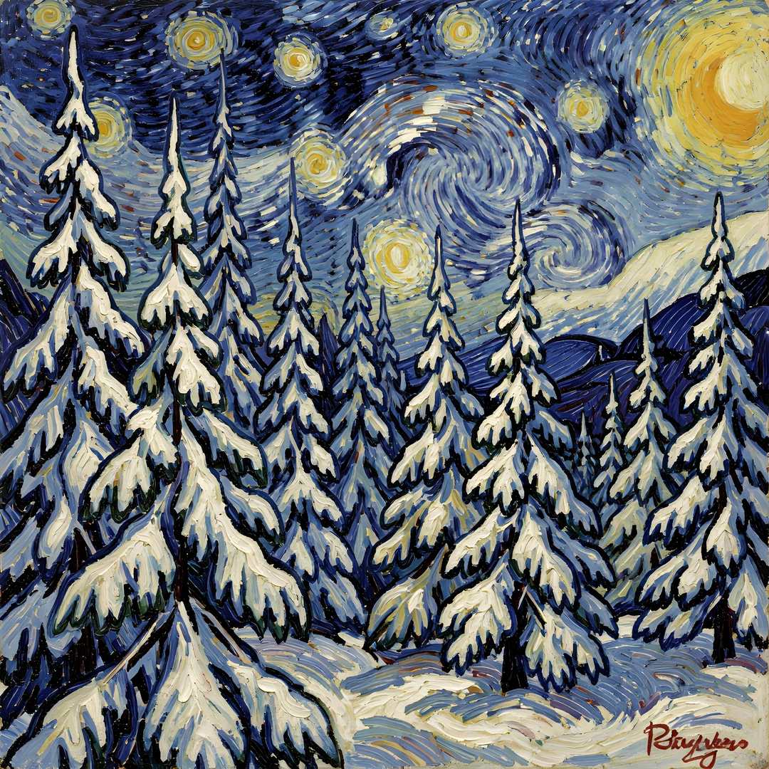 forest gogh pine snow storm style under van