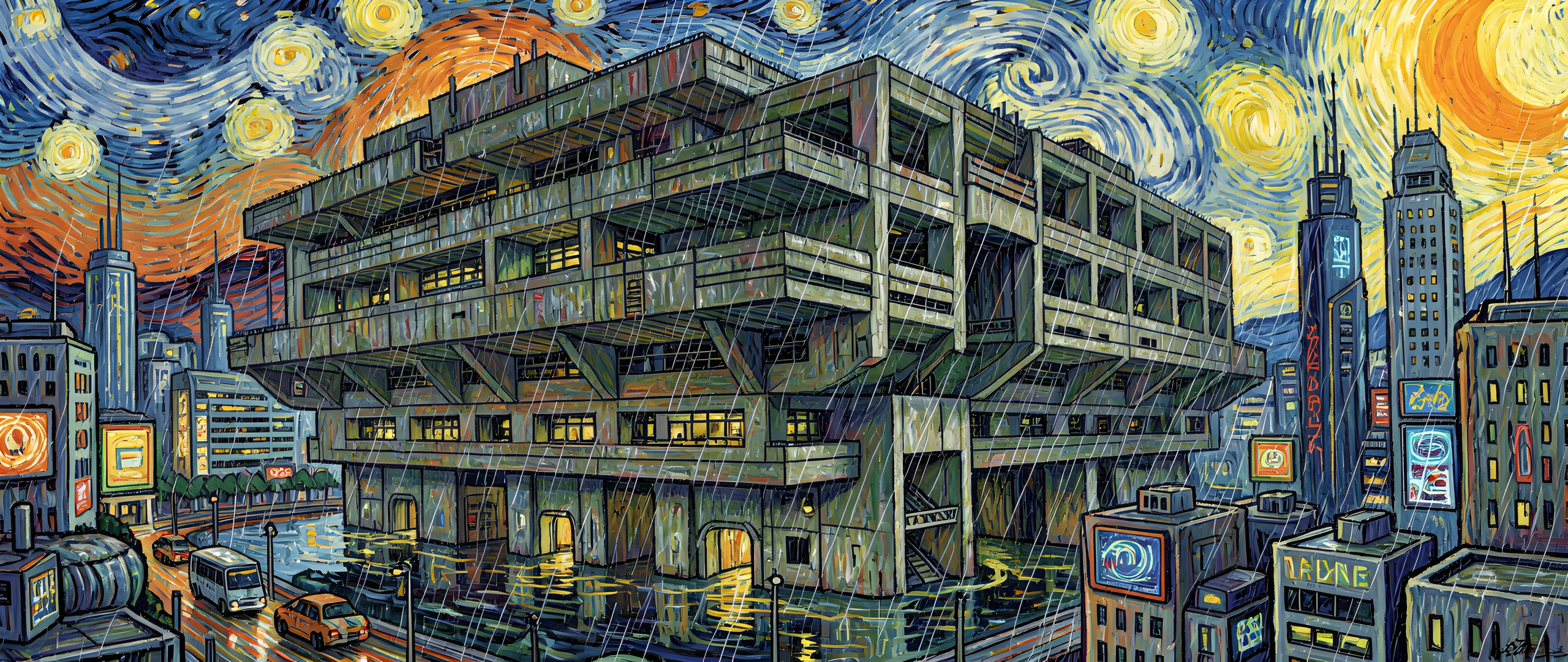 brutalist futuristic gogh megastructure rain style urban van