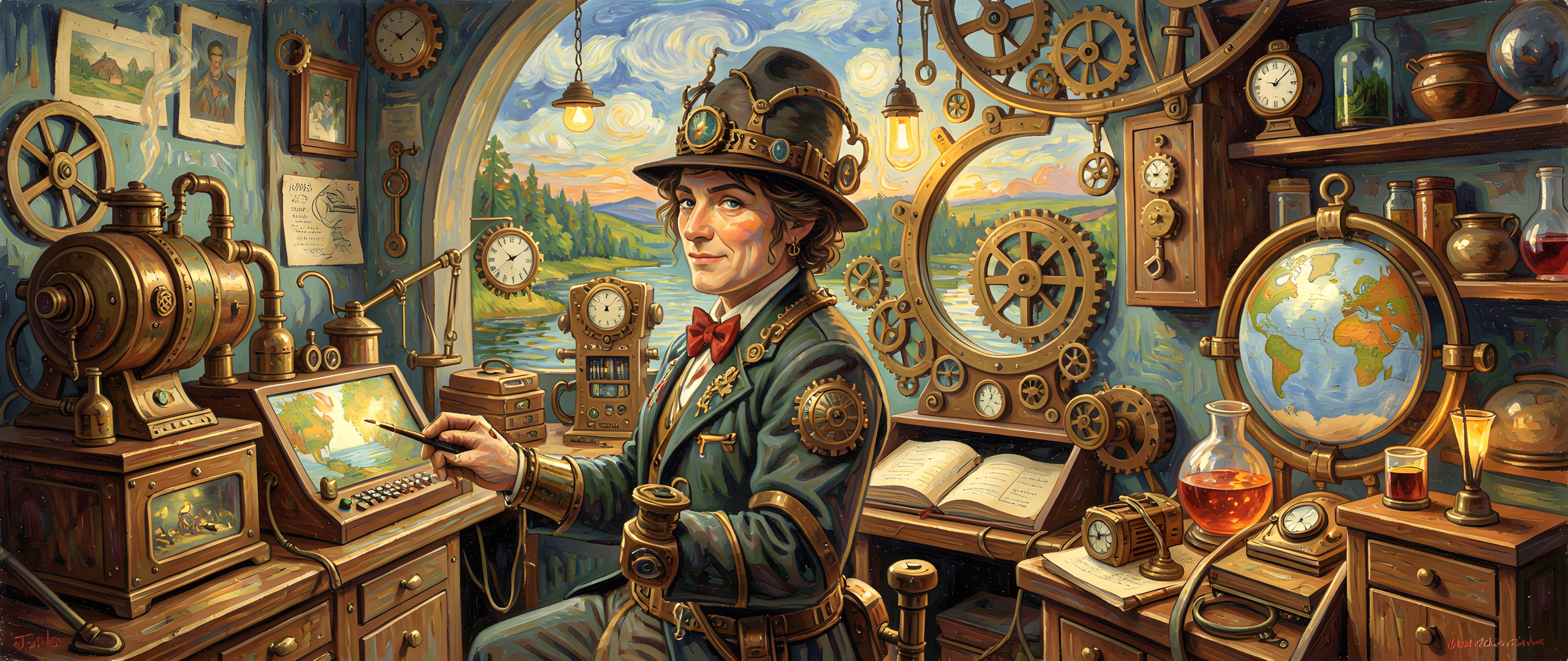 dappled impressionist inventor lab light monet painting steampunk style