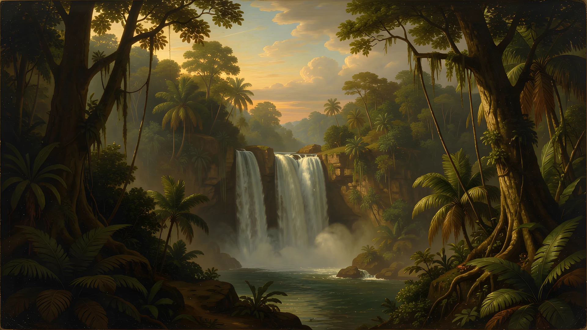 caravaggio jungle paradise style sunrise waterfall
