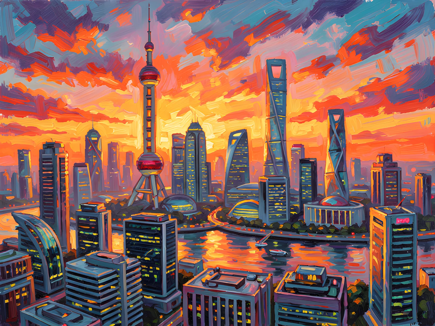 brushstrokes colorful colors futuristic impressionist post shanghai sunrise thick urban