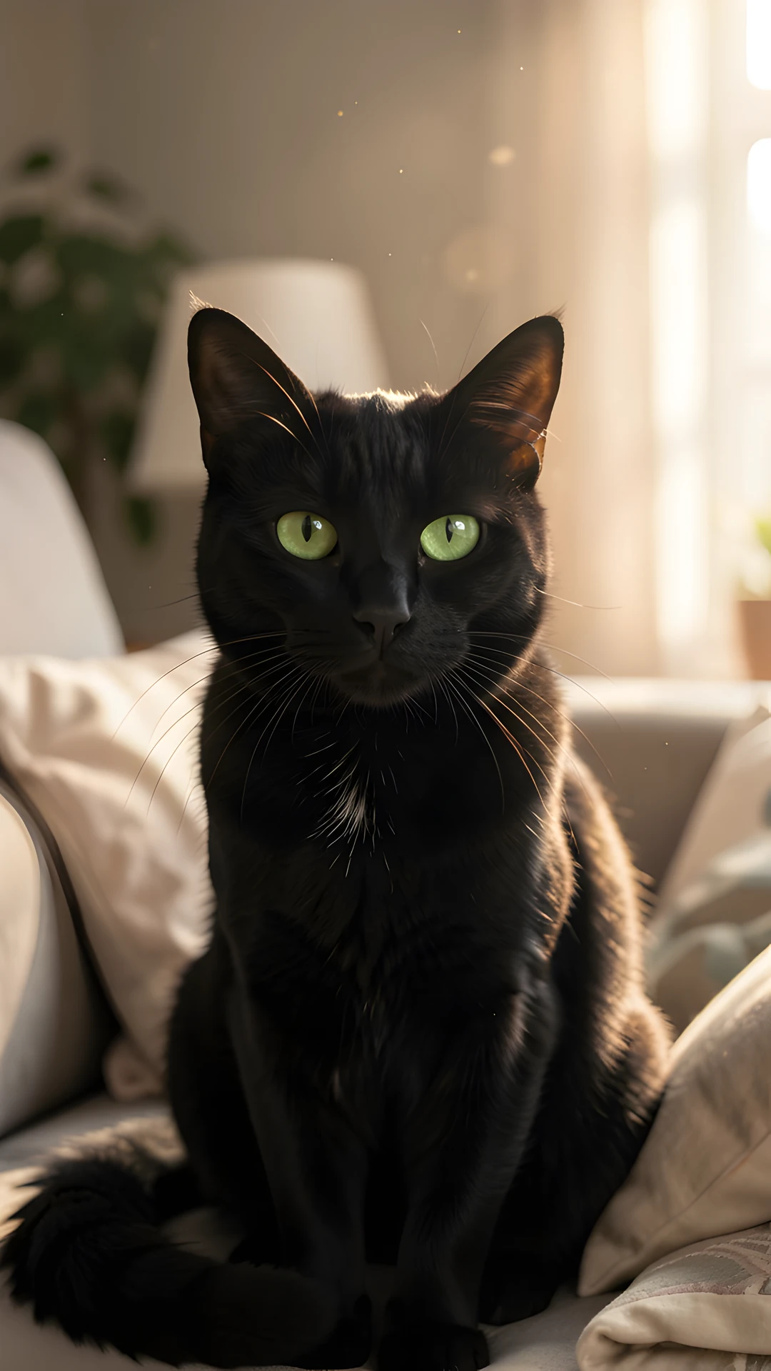 black cat dreamy eyes green indoor