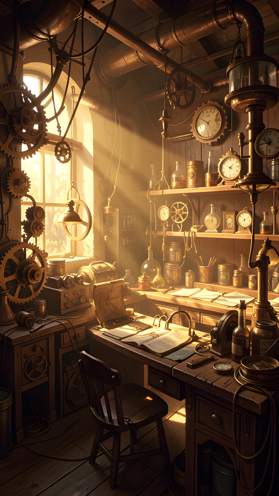 deep golden highlight inventor lab shadows steampunk sunlit
