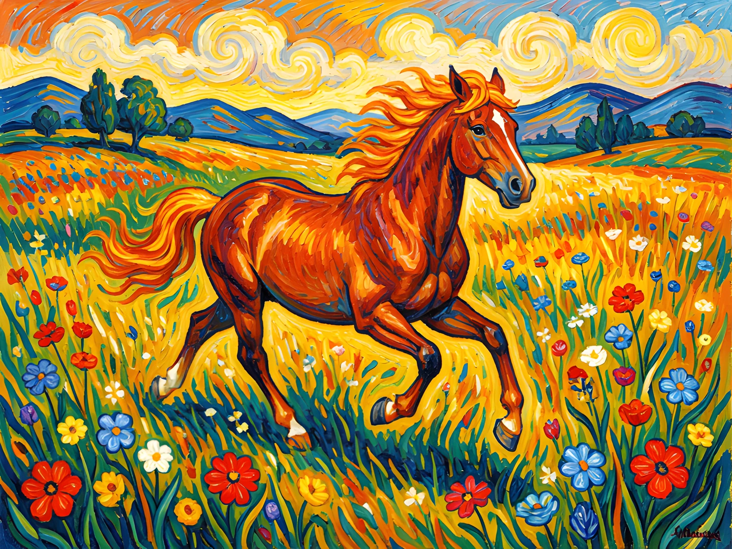 colorful colors field gogh horse running style van