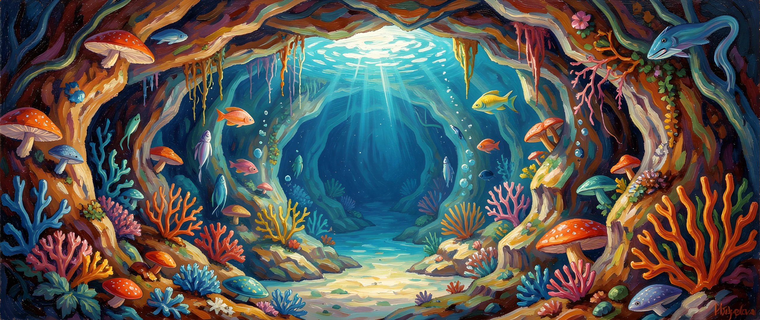 botticelli brushstrokes cave colorful colors impressionist light post style thick underwater