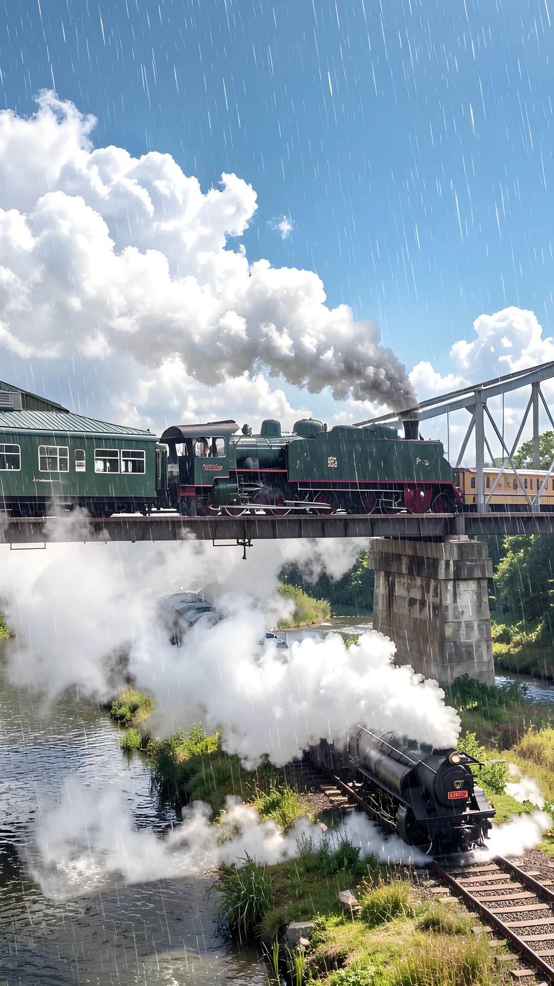bridge cloud noon rain steam train