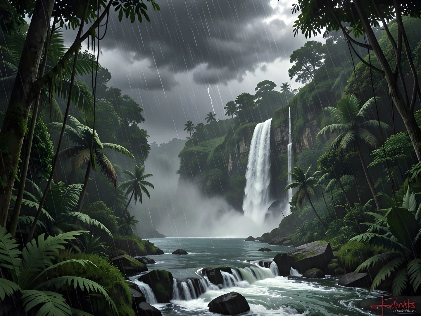 jungle paradise storm under waterfall