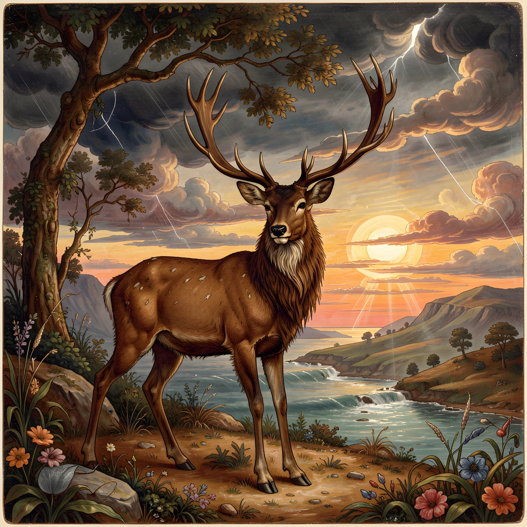botticelli deer highland mist storm style sunset under