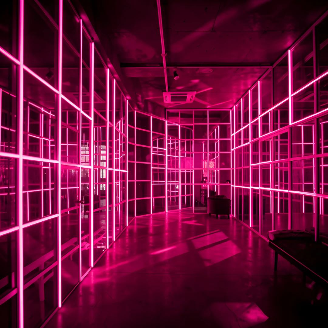 dappled grid impressionist indoor light moody neon pink urban