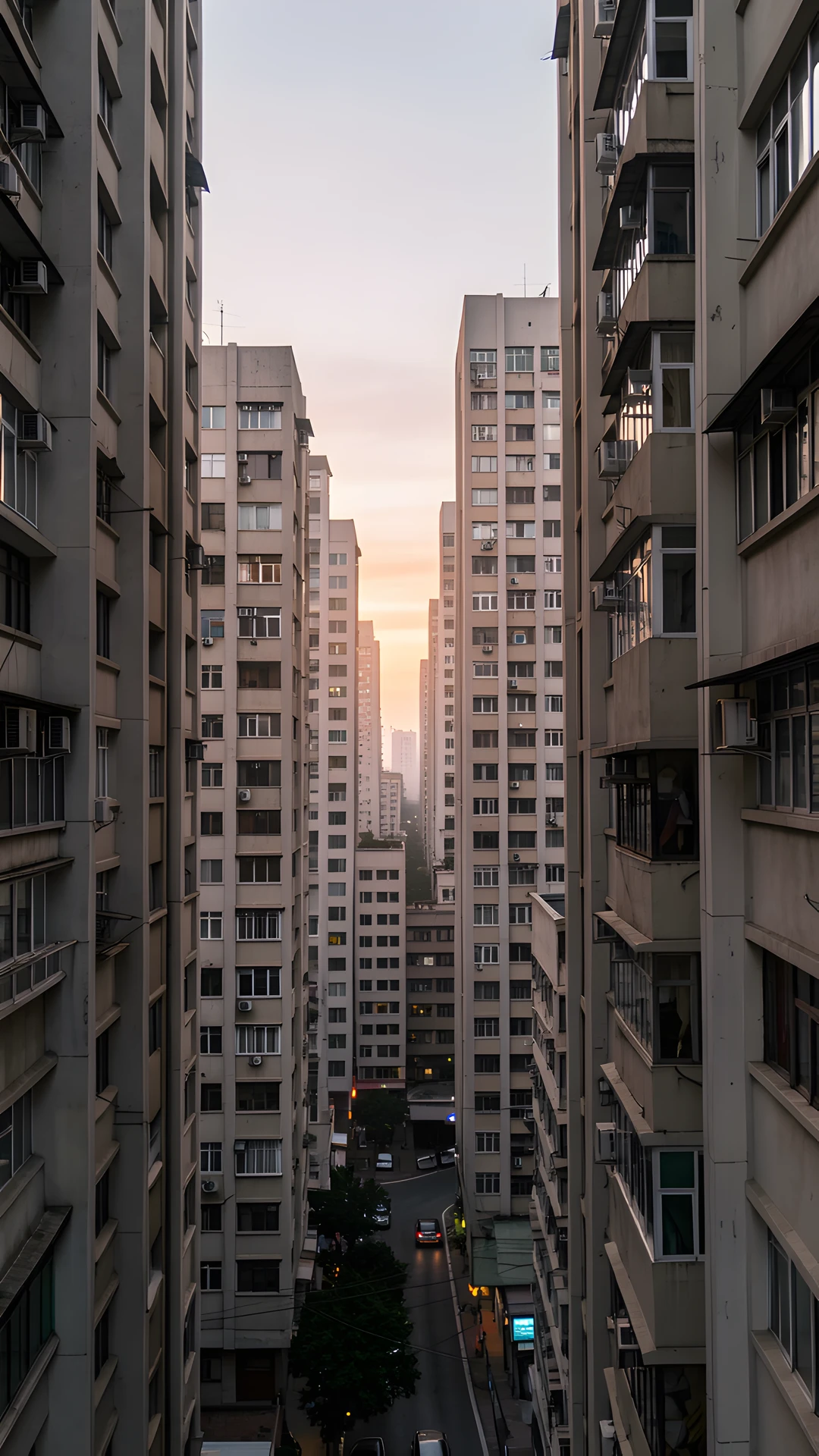 brutalist dense diffused light soft sunrise towers urban valley