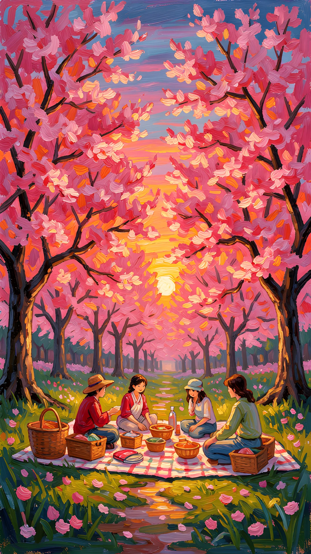 brushstrokes colorful colors forest hanami impressionist picnic pink post sunset thick