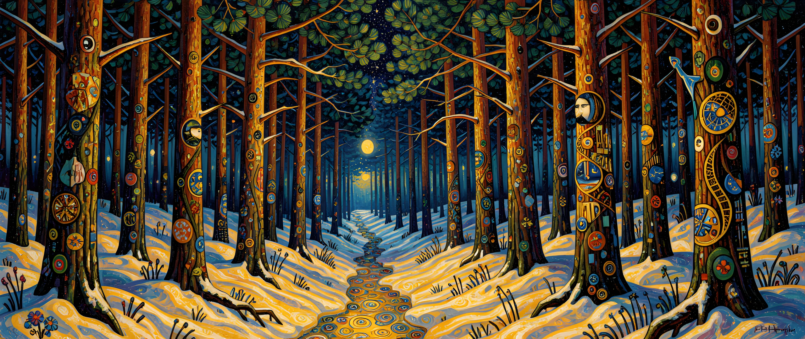 colorful colors dark forest golden klimt night phase pine snow