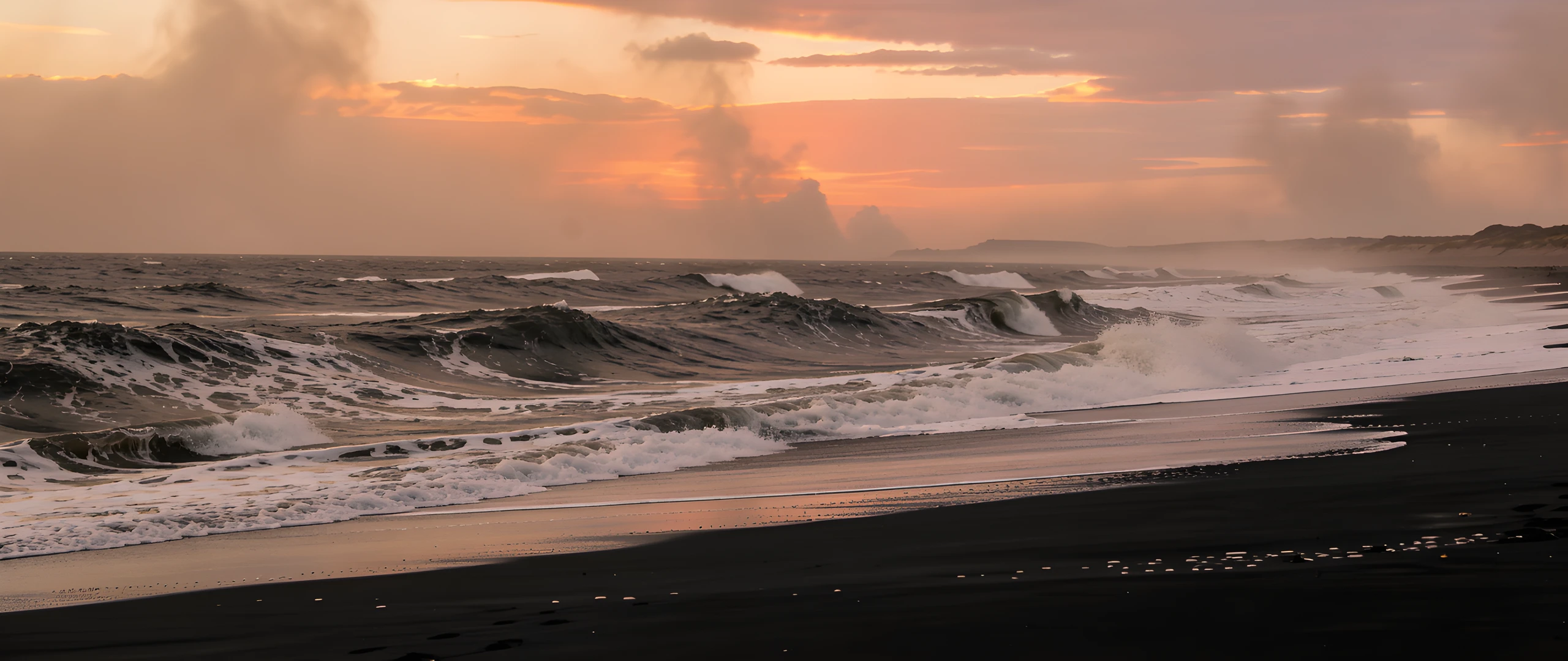 black coast crashing sand storm sunset waves