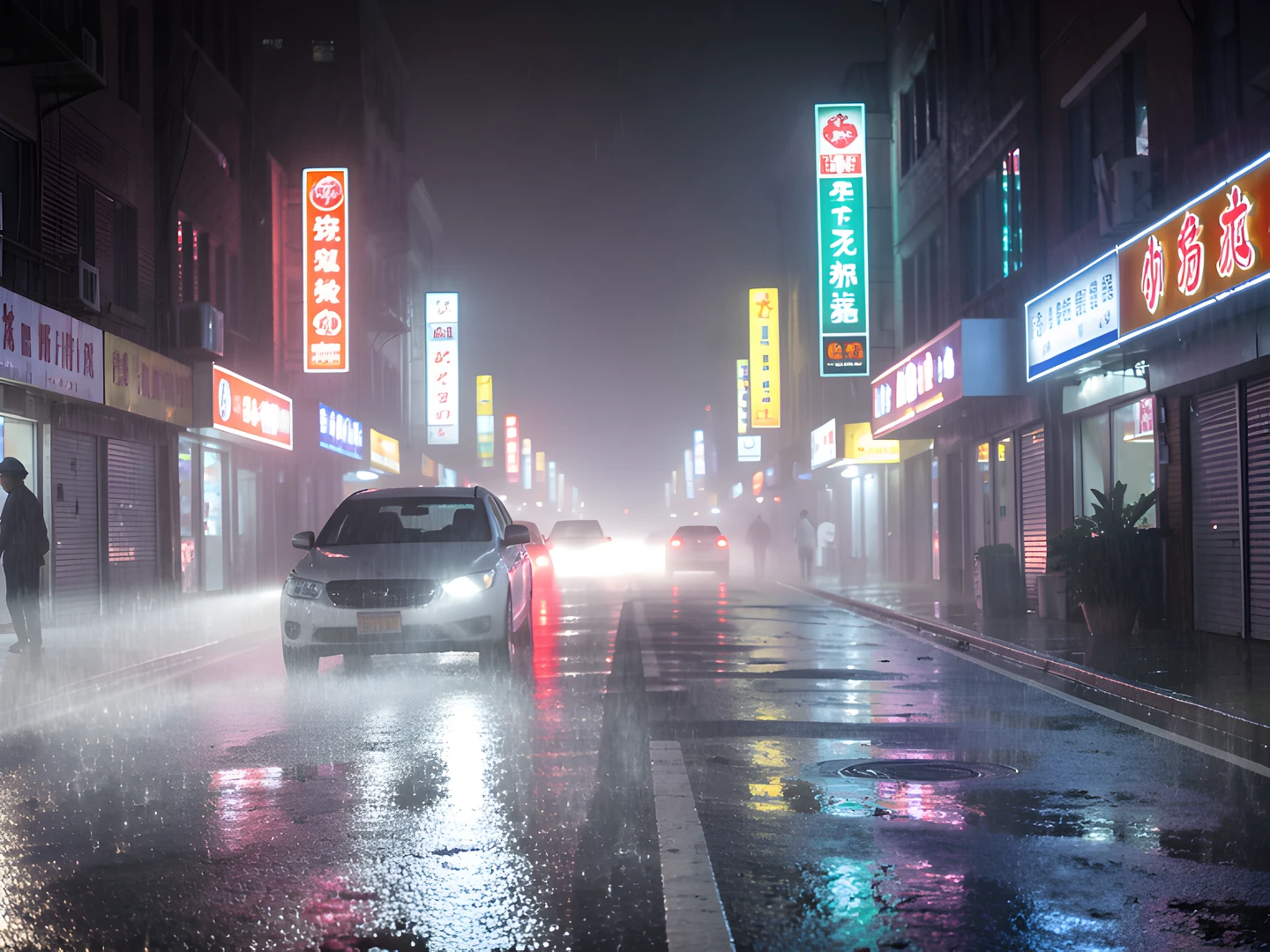 mist neon night rain slicked street