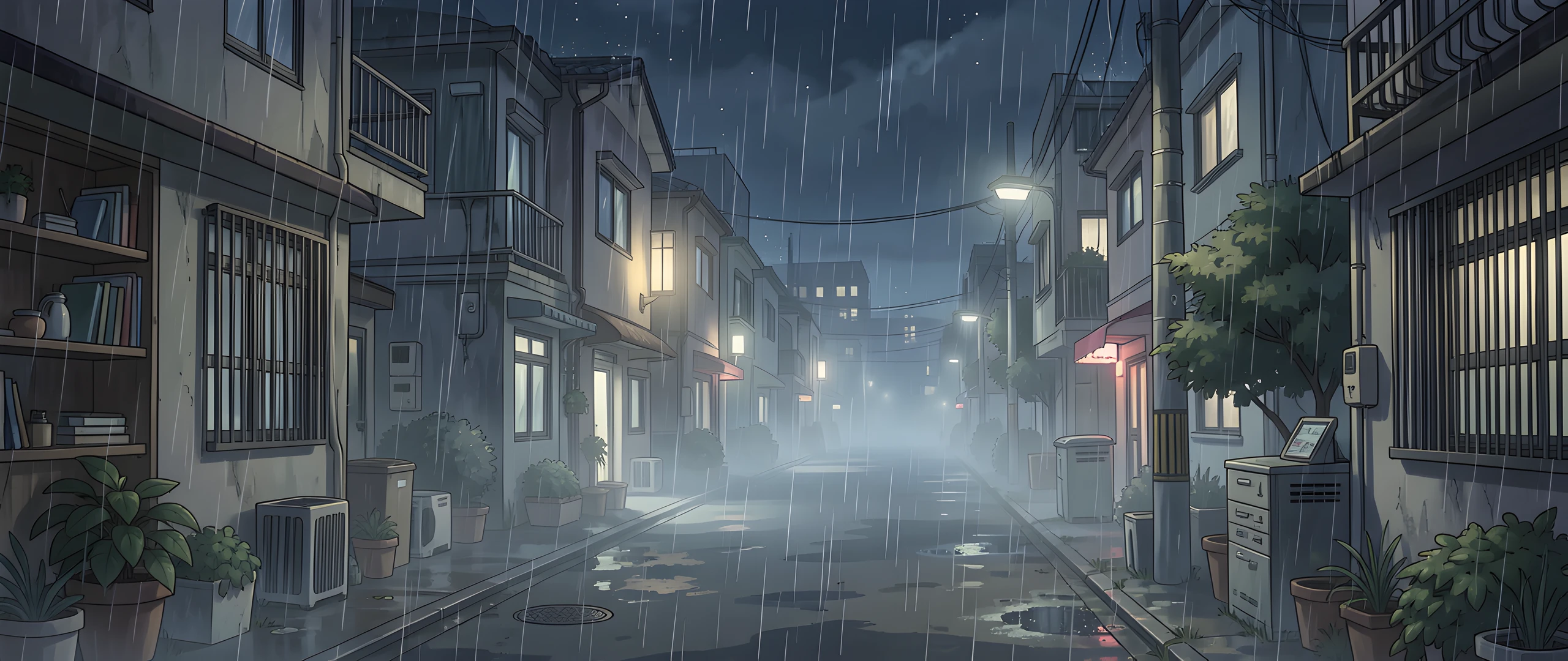 anime atmosphere domestic mist night quiet rain urban