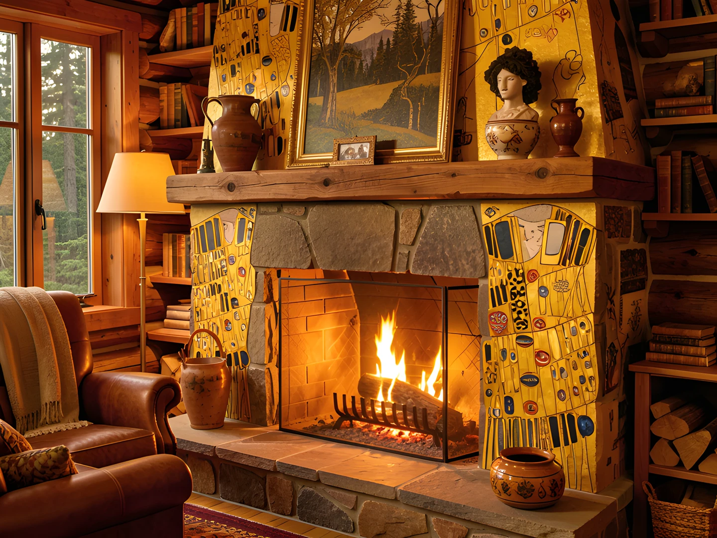 cabin cozy fireplace golden klimt phase