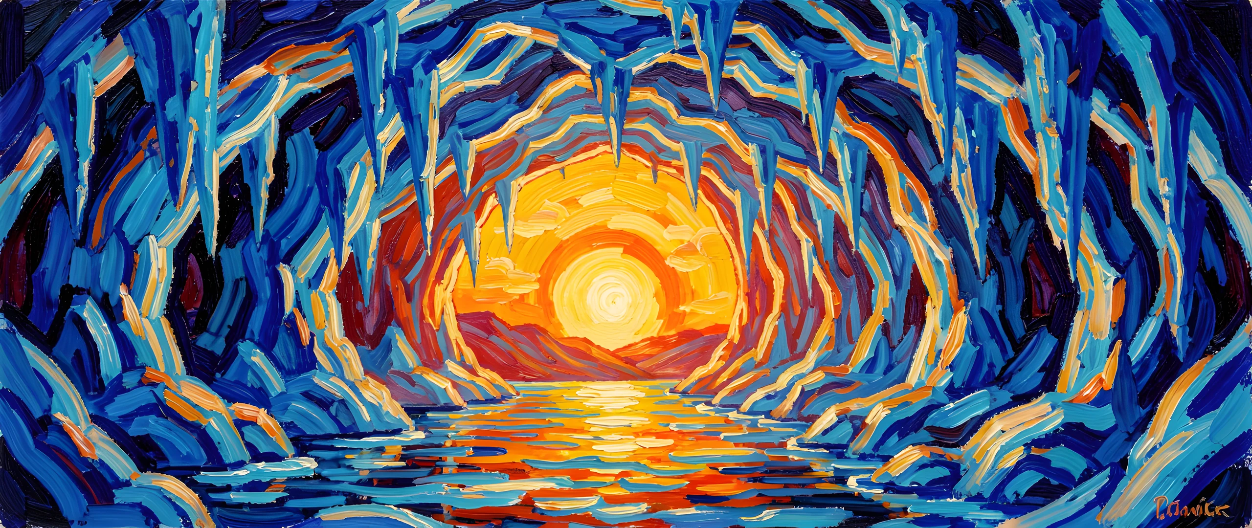 blue brushstrokes cave colorful colors ice impressionist interior post sunrise thick