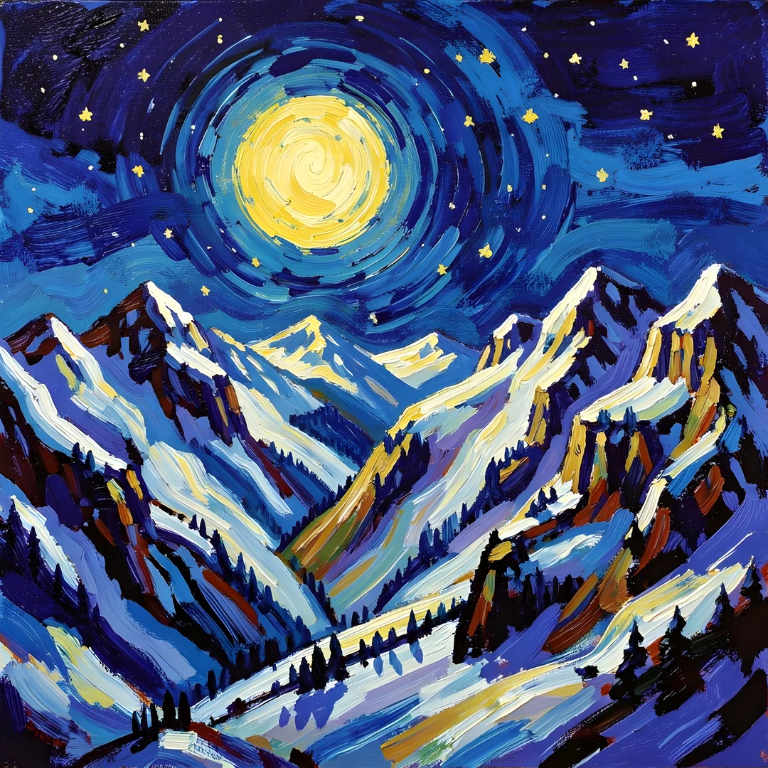 brushstrokes chiaroscuro colorful colors impressionist moon mountain post snow thick