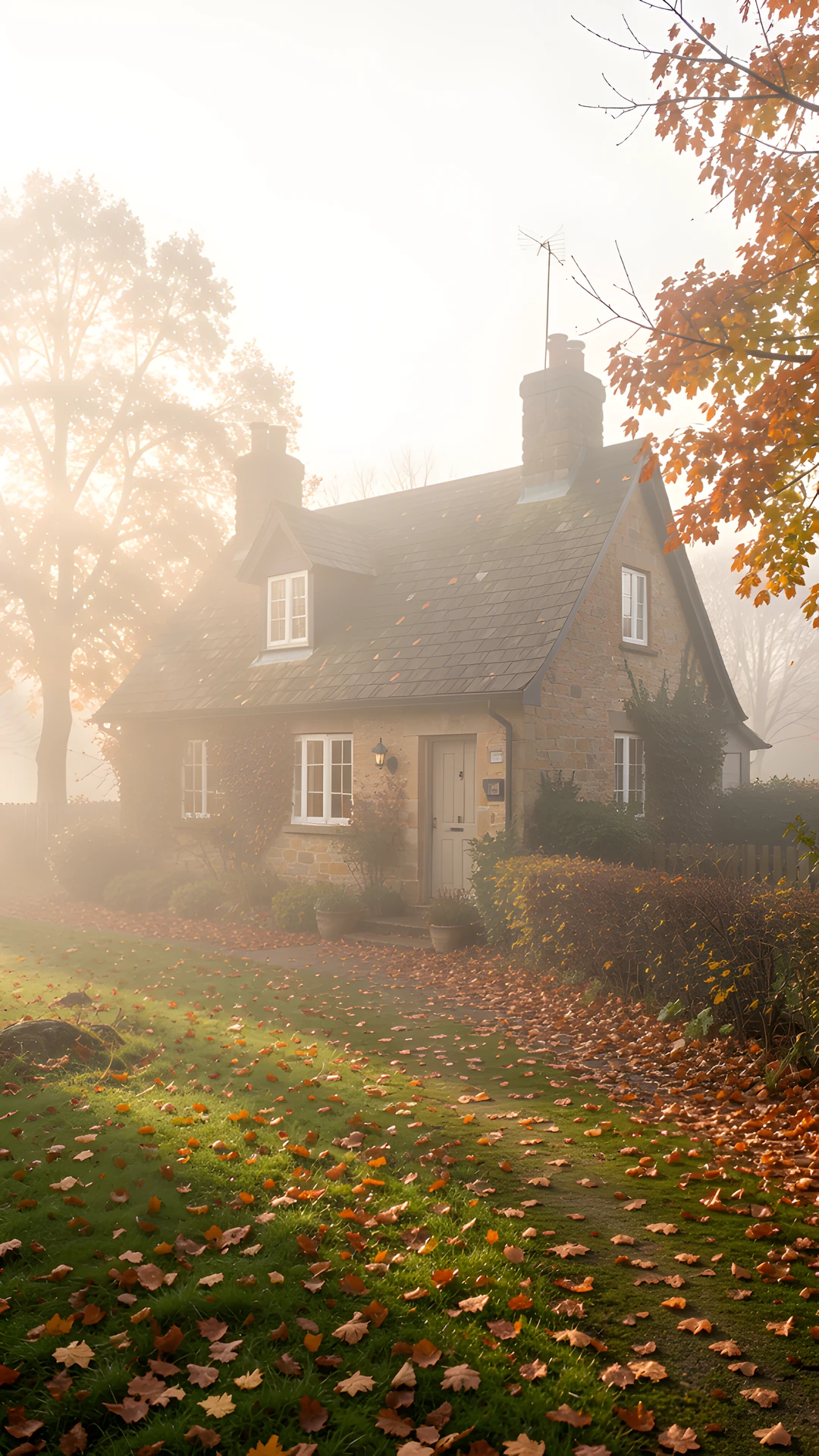 autumn cottage mist morning