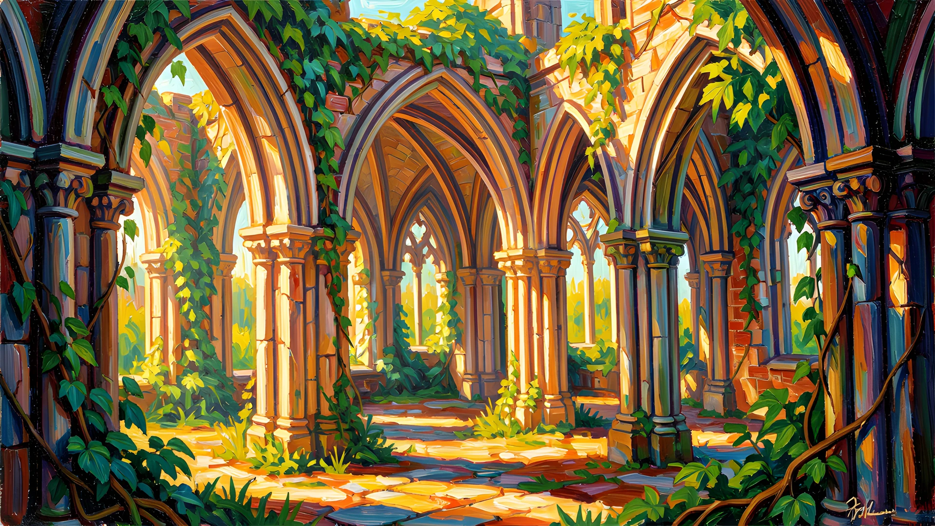 ancient arch brushstrokes colorful colors gothic impressionist ivy post sunlit thick