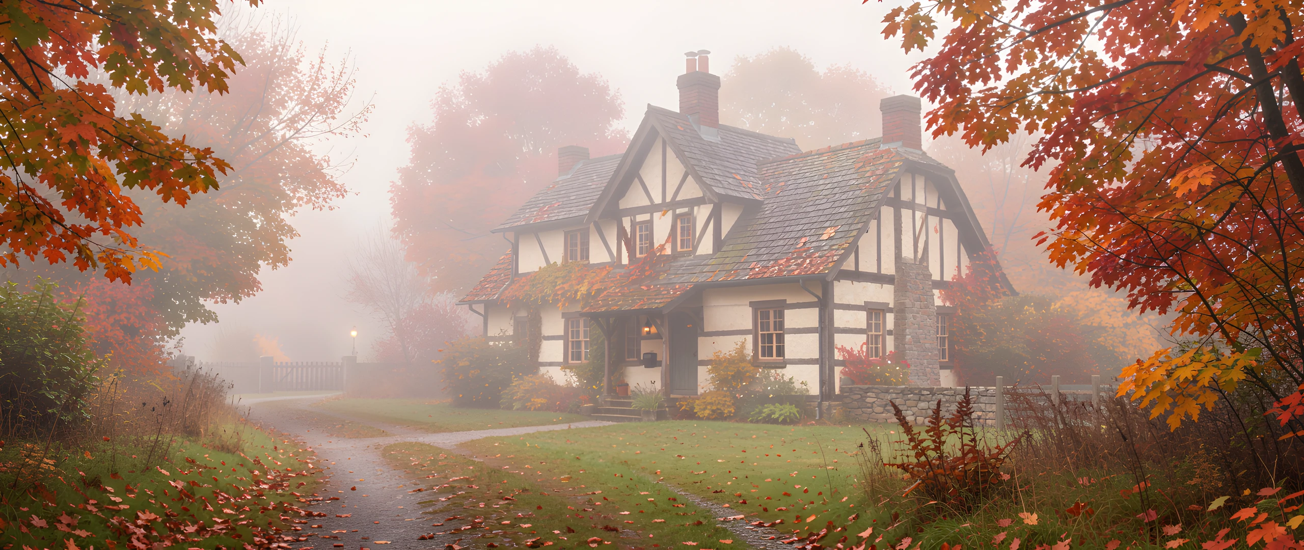 autumn colorful cottage mist morning