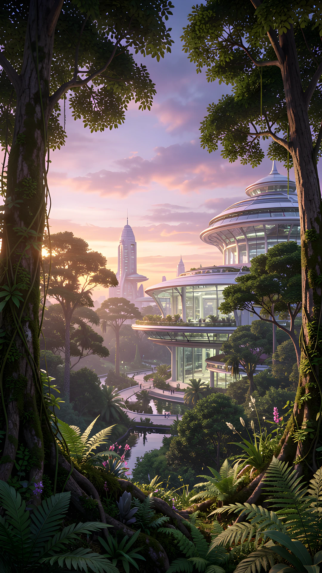 arcology bright forest sunset utopian