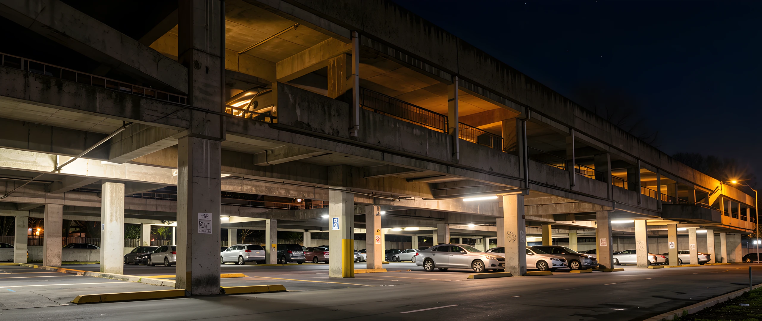 brutalist nighttime parking structure sunlit