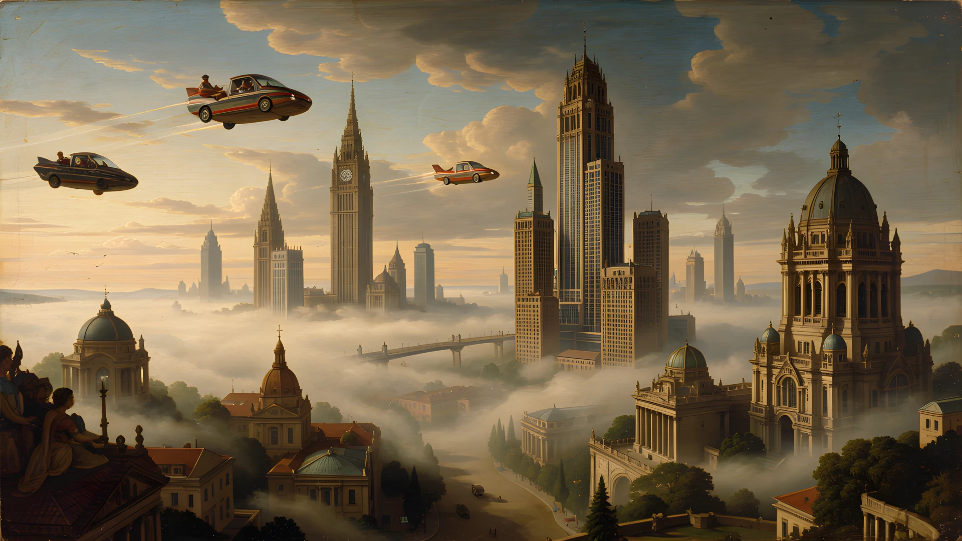 cars flying masterpiece mist renaissance skyscrapers