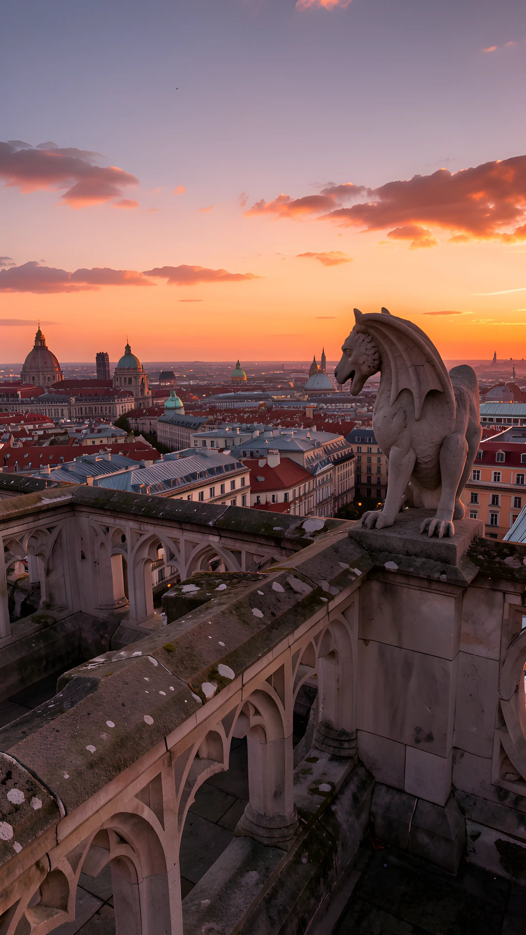 gargoyle rooftop sunset urban view
