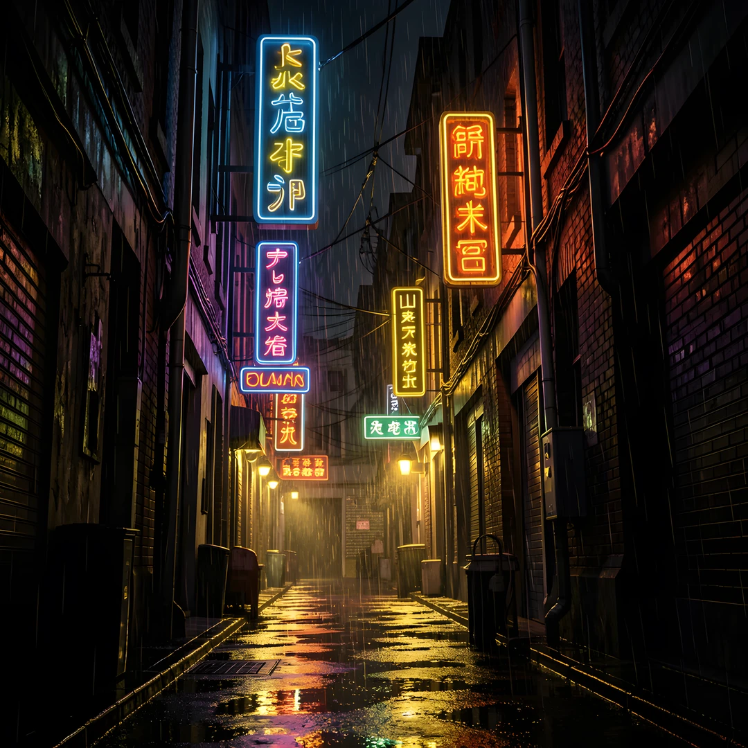 alley dark deep golden highlight neon rain shadows signs