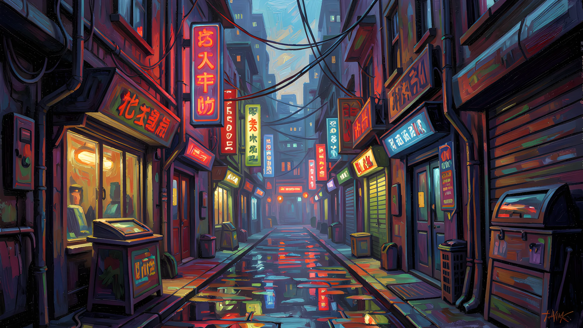 alley brushstrokes colorful colors impressionist neon post sfumato shadowy technique thick