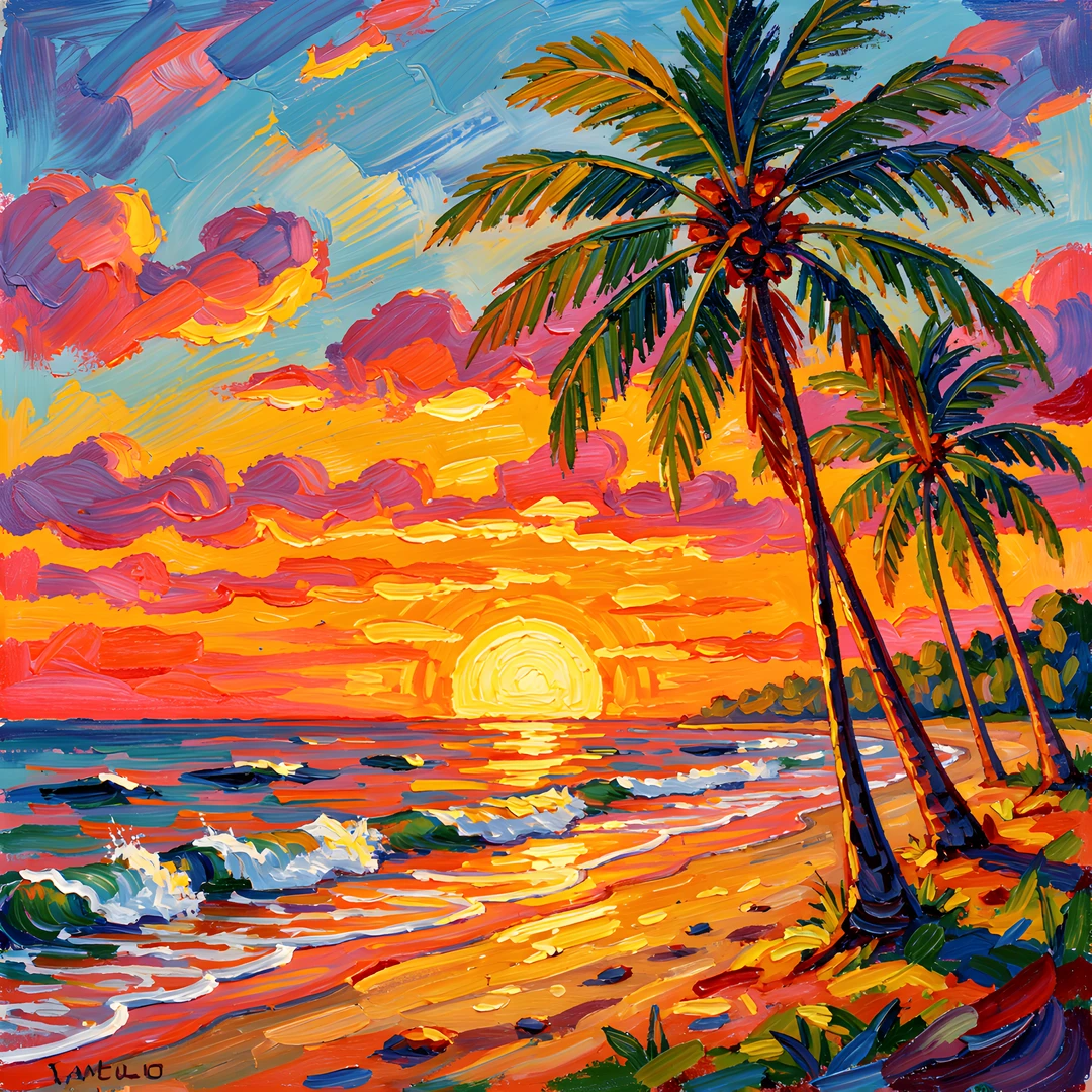 brushstrokes coast colorful colors forest impressionist palm post sunrise sunset thick