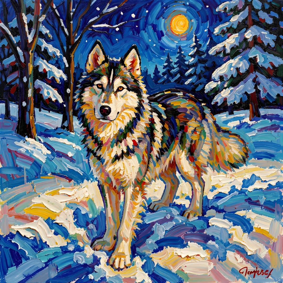 brushstrokes colorful colors dog husky impressionist night post snow thick