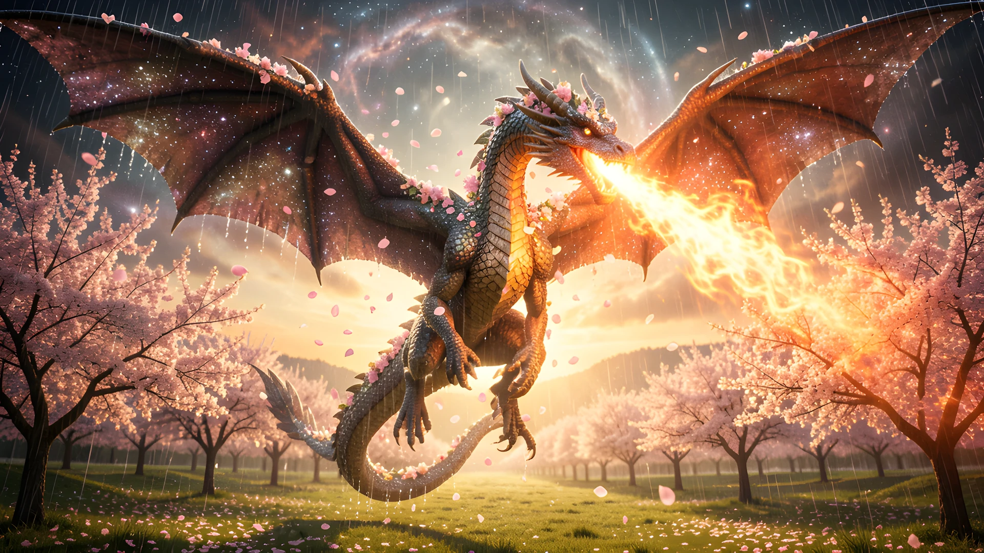 against amidst as before blossom blossoms body casting cherry cling colossus delicate distance downpour drooping ethereal fixed gaze gloom horizon it its landscape lone mechanical mist mountain out patina petals pink rain relentless rugged rusty sentinel shrouds sky soaked stands steel stretches terrain their tibetan turbulent valley veil weathered